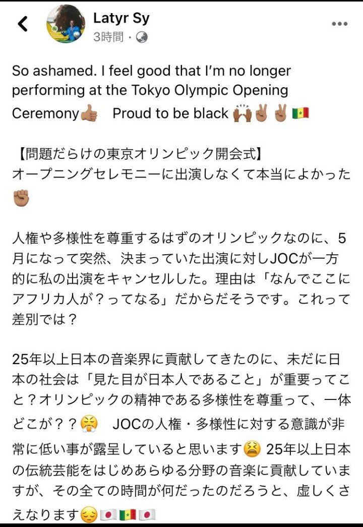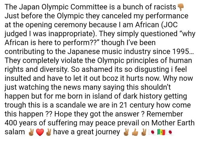 日本オリンピック委員会は人種差別主義者の集まりです👎🏽オリンピックの直前、私はアフリカ人であるため、開会式で私のパフォーマンスをキャンセルしました(JOCは私が不適切であると判断しました)。 彼らは単に「なぜアフリカ人が演じるためにここにいるのか?」と質問した。 私は1995年から日本の音楽業界に貢献していますが…彼らはオリンピックの人権と多様性の原則に完全に違反しています。 とても嫌なことを恥ずかしく思って、私は侮辱されたと感じて、今それが痛いのでそれを出さなければなりません。 なぜ今、多くの人がこれは起こらないはずだと言っているニュースを見ているのですが、暗い歴史の島で生まれた私にとって、これは21世紀のスキャンデールです。 彼らが答えを得たことを望みますか? 400年の苦しみが母なる地球のサラムに平和をもたらすかもしれないことを忘れないでください✌🏽❤️✌🏽素晴らしい旅を