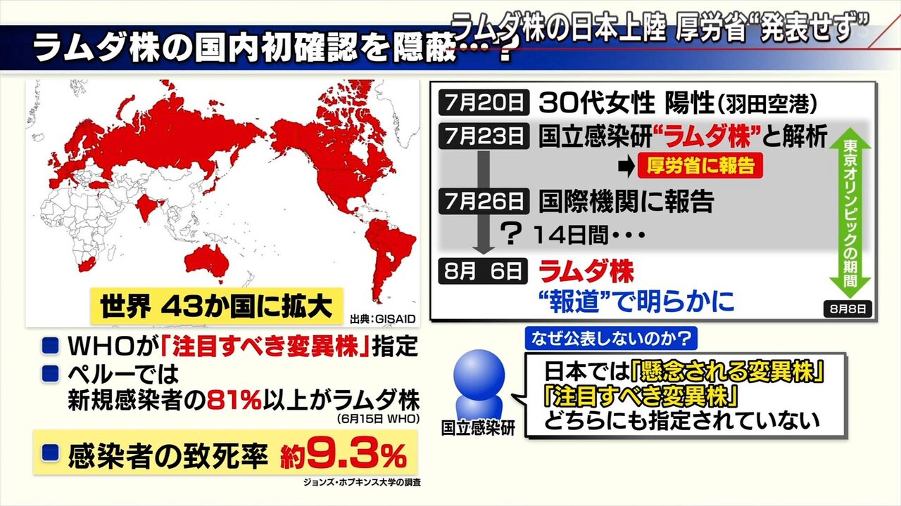 羽田空港で陽性反応が出た30代女性からラムダ株を解析、7月26日に国際機関に報告したという国立感染症研究所の「日本では懸念すべき変異株、注目すべき変異株のどちらにも指定されていない」とのコメントを紹介。
