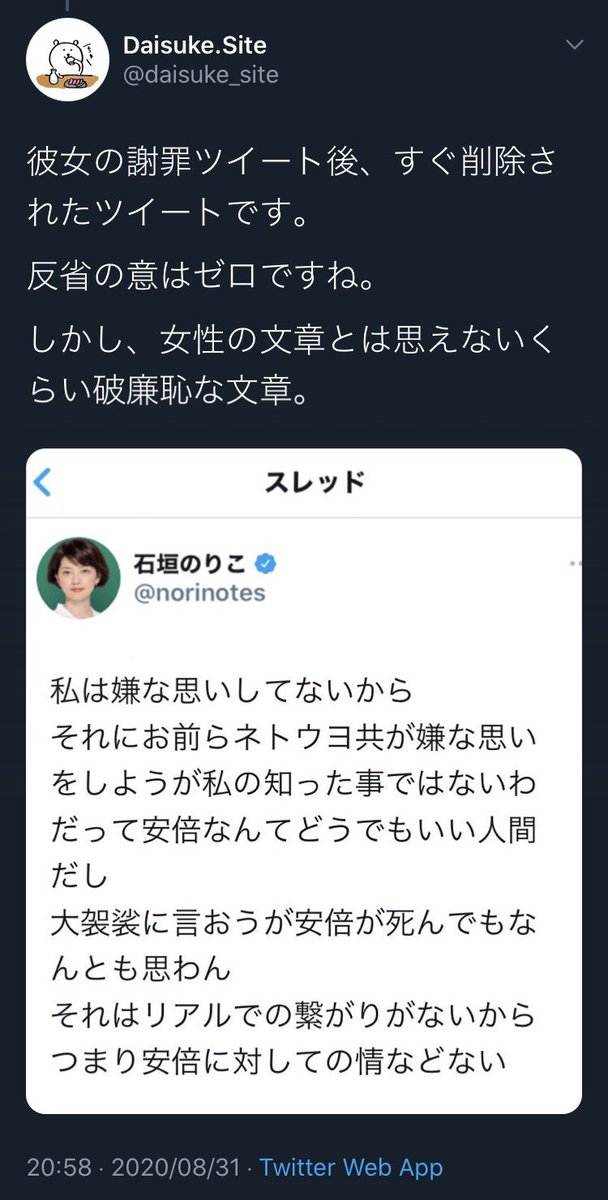 石垣氏は同28日、体調不良を理由に辞任を表明した安倍氏について「大事な時に体を壊す癖がある危機管理能力のない人物」などと投稿、