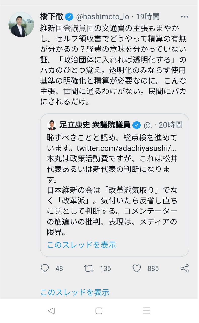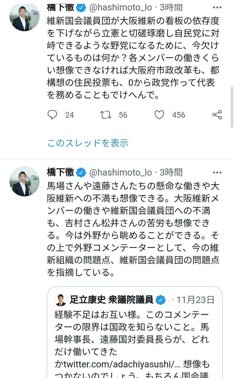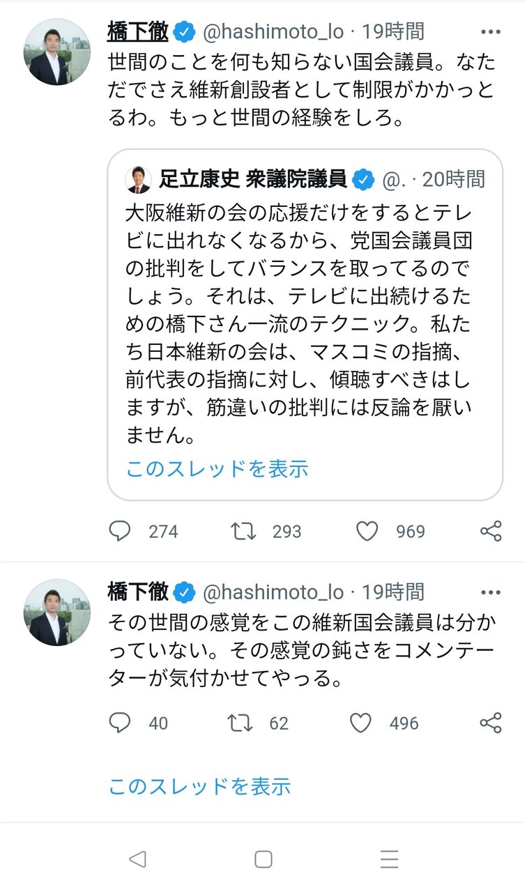 橋下も流石に少なとも表では市役所職員にアホバカとは言わないが足立は国会でアホバカって言って議長に咎められてる