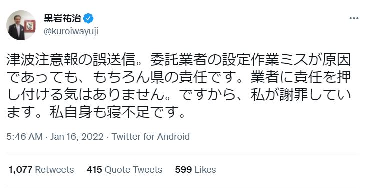 2本目で「度重なる深夜の津波注意報の誤送信により、多くの県民の皆さんが眠れない夜を過ごされたと思います。