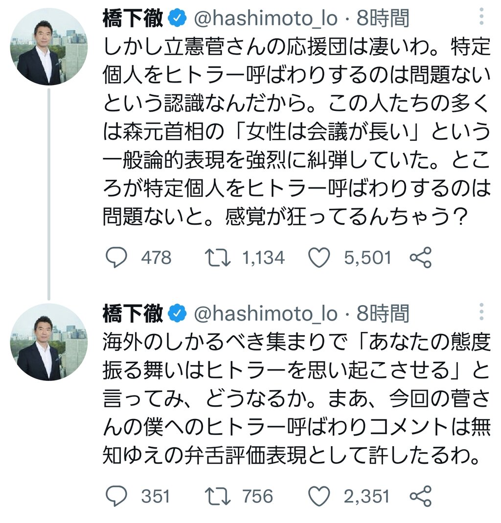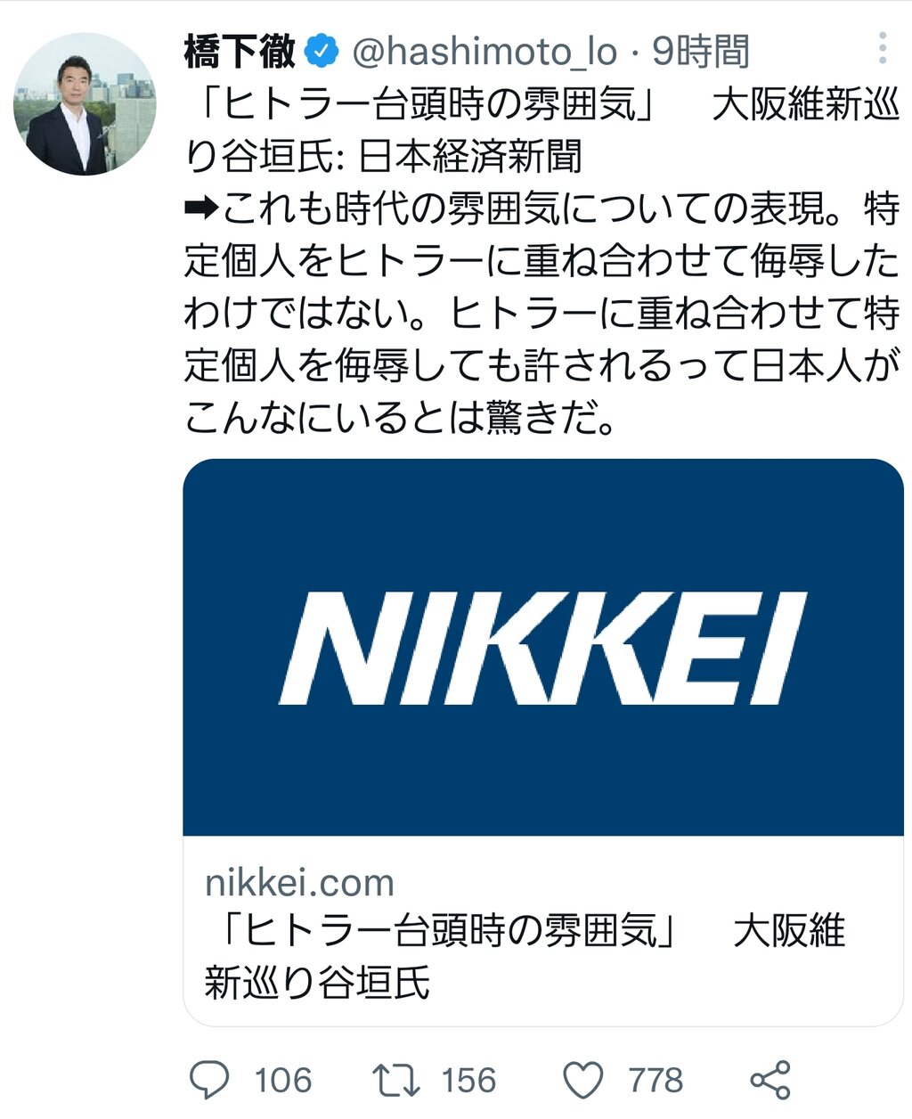 橋下徹「俺が立憲民主党をヒトラーと重ね合わせることは許される。立憲民主が維新をヒトラーに重ね合わせることはゆるはない」