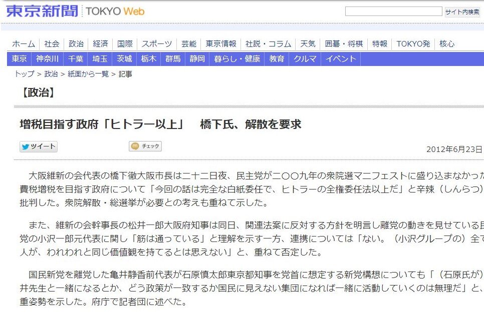 だが「橋下徹や維新=ヒトラー及びナチス的なのは事実」という記事になるかもしれん