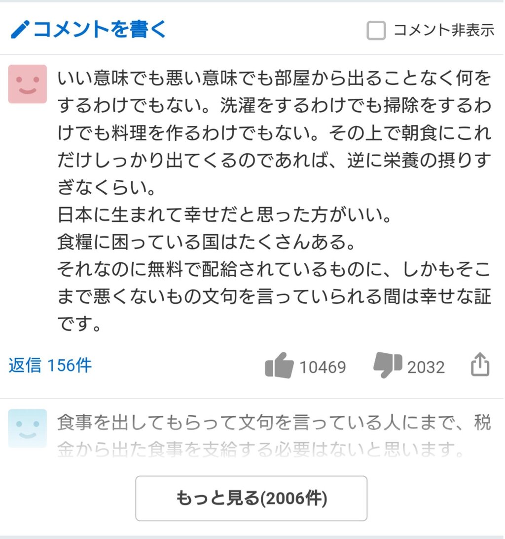 ただ、ホテル側が療養者に対して配慮したした食事を出させるように監督・指導するのは行政の仕事であり、行政がきちんとホテル側を監督・指導しているか監視するのが議会だが、それがなされていない段階で、行政及び議会は追及・批判されて然るべき事。