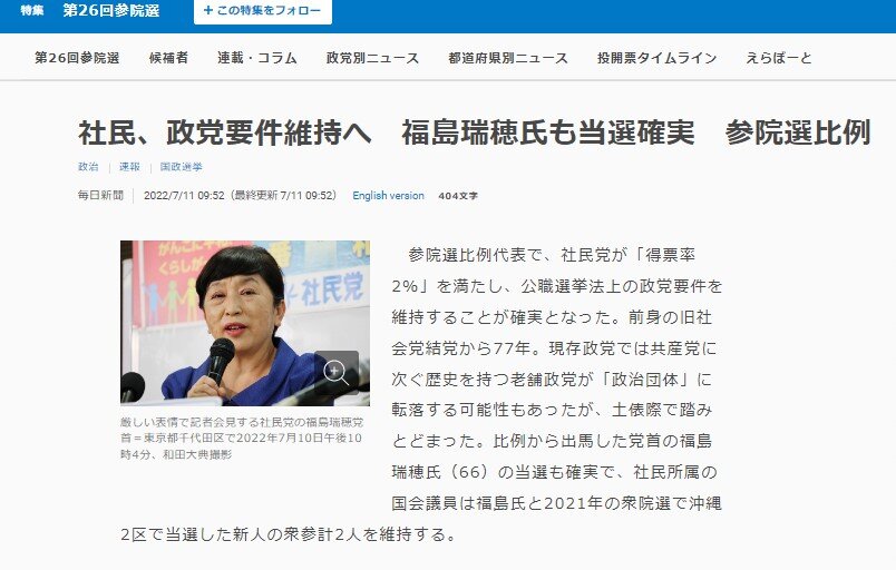 「福島瑞穂さん無念の落選、社民党消滅へ」
