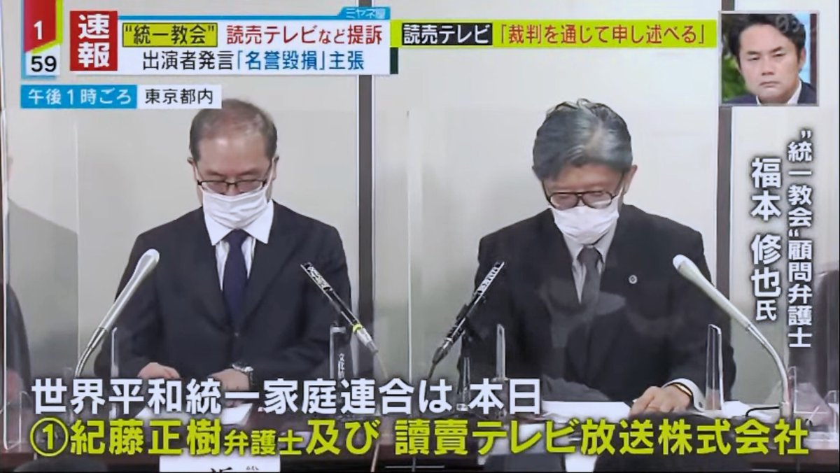 旧統一教会側は、読売テレビの「情報ライブ ミヤネ屋」内での紀藤正樹弁護士と本村健太郎弁護士、TBSの「ひるおび」内での八代英輝弁護士の発言で名誉を毀損(きそん)されたと主張している。読売テレビと紀藤弁護士、同社と本村弁護士、TBSと八代弁護士にそれぞれ2200万円の支払いを求めている他、謝罪の広告と放送も求めている。