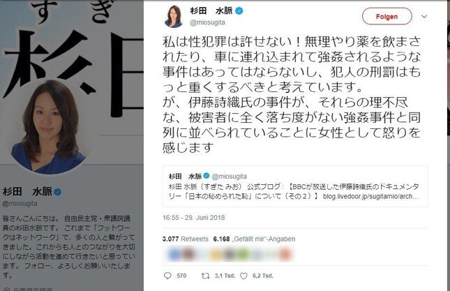 >杉田議員は2018年6~7月、ツイッター上で「枕営業の失敗」「ハニートラップ」「売名行為」などと伊藤氏を中傷した第三者の投稿計25件に「いいね」を押した。