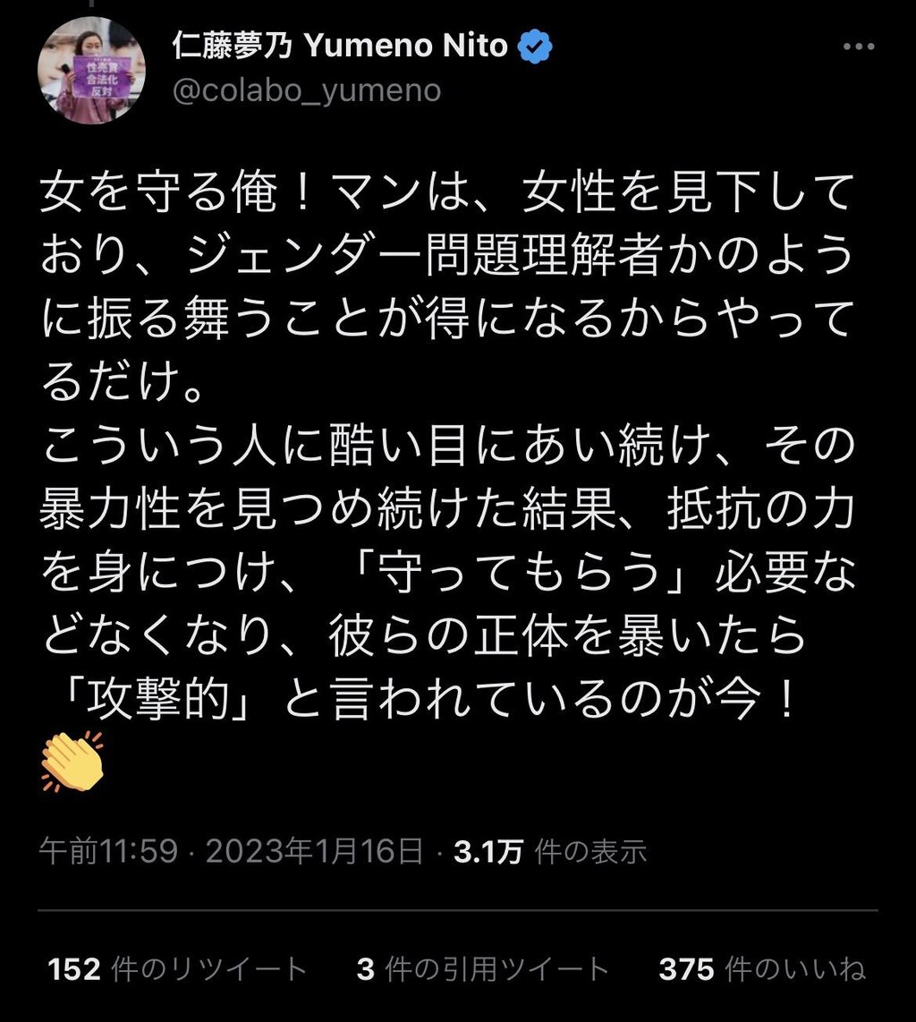 この争いってもう思想的な左右は関係ないしフェミかどうかも関係なくて草