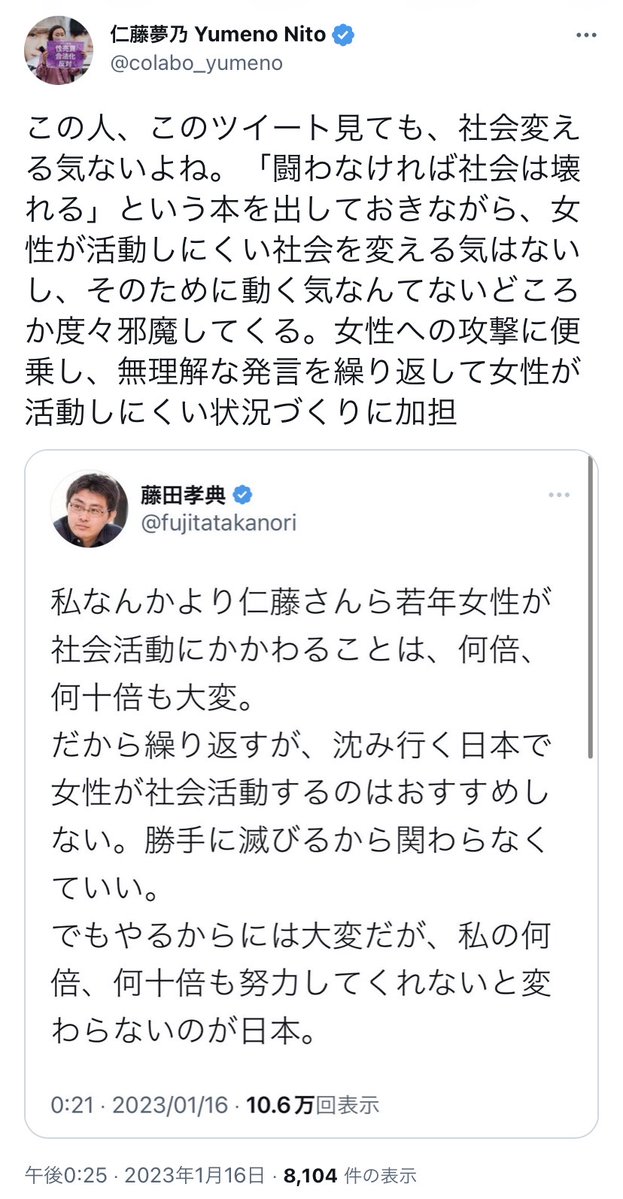 最近の藤田はフェミニズムを応援するじゃなくフェミニズムを指導する側気取りだしたからな
