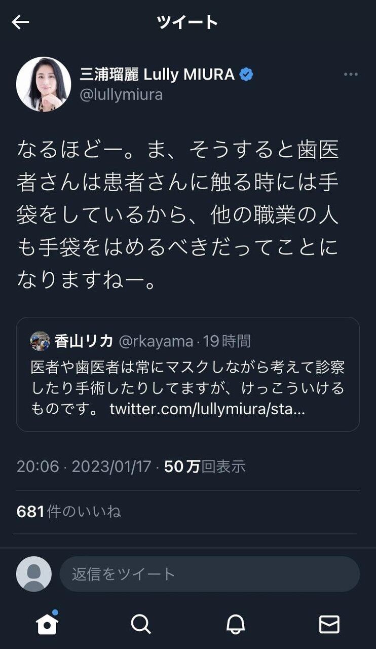 それで「歯医者は手袋もつけてるんだから医者じゃなくても手袋すべきですねw」って皮肉ったつもりで返してる