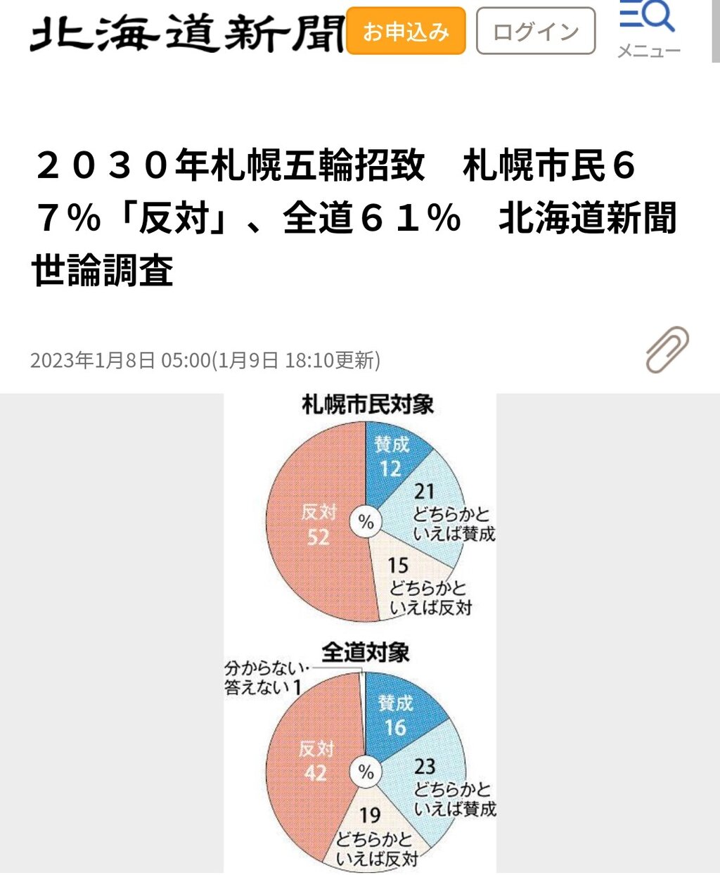 北海道新聞社は2022年12月16~18日、札幌市が目指す2030年冬季五輪・パラリンピック招致について18歳以上の札幌市民を対象に電話による世論調査を行った。招致への賛否は「反対」「どちらかといえば反対」と答えた人が計67%で、「賛成」「どちらかといえば賛成」の計33%の2倍となった。同じ日程で行った全道調査も反対意見が計61%で、賛成意見の計39%を上回った。