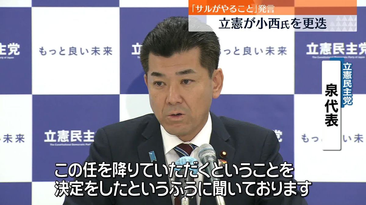 小西氏は憲法審査会の毎週開催は「サルがやること」などと発言しており、泉氏は「党の見解とは異なる。厳しく注意した」と述べた。