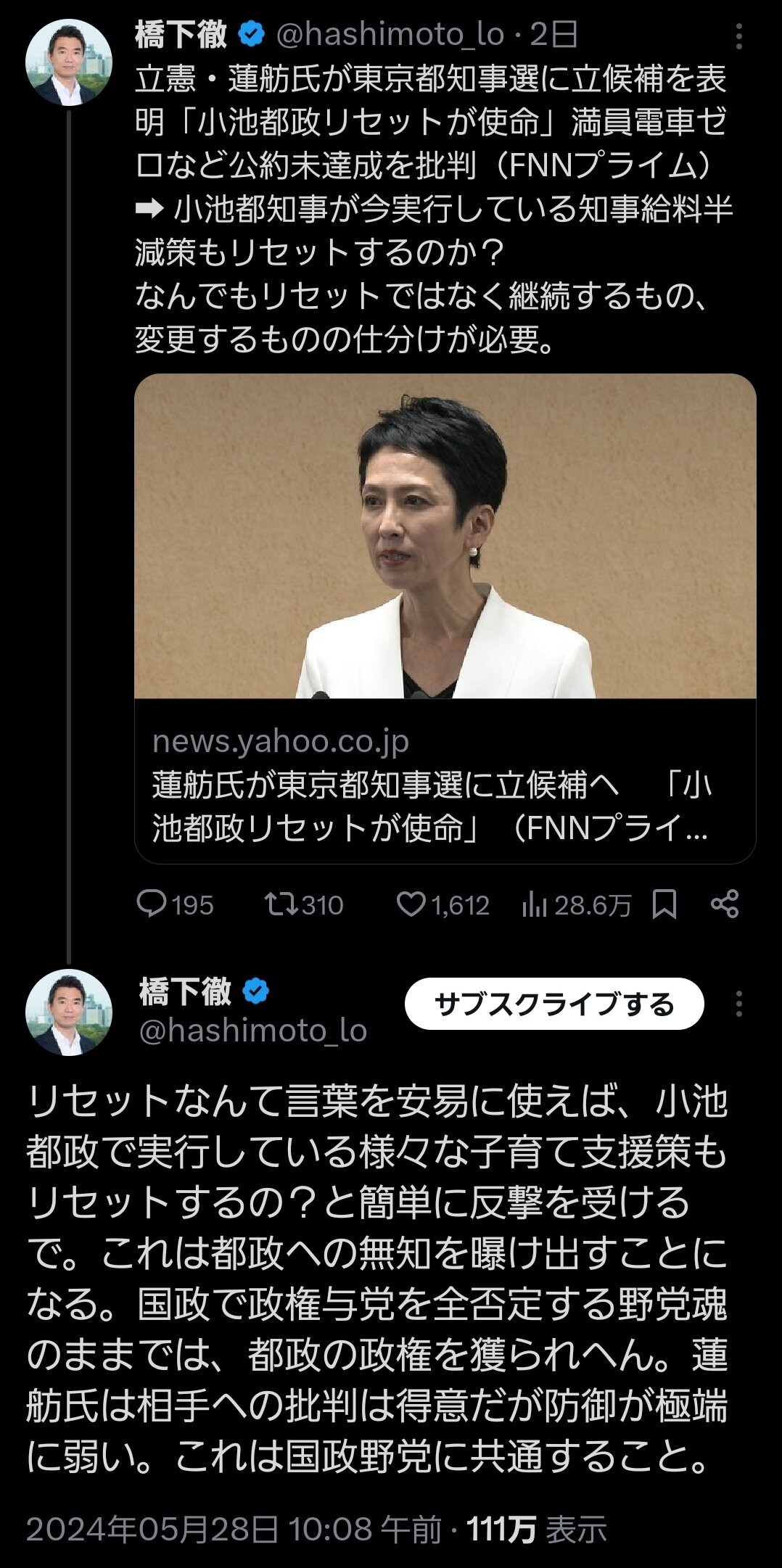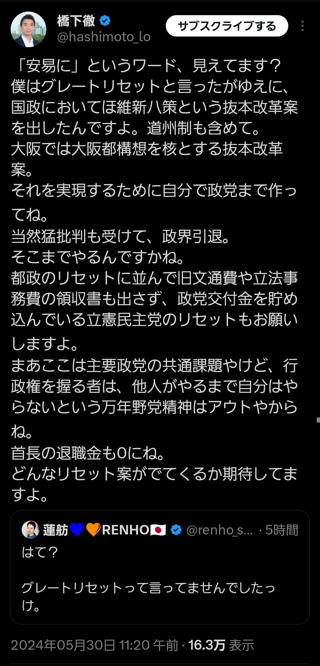 橋下徹「蓮舫はリセットという言葉を使って無知を曝け出してる」蓮舫「あんたもグレートリセット言うとるやん」橋下「俺は違うんや!」 2024年06月03日 カテゴリ:言論人 1: 警備員[Lv.6][新芽] 2024/05/30(木) 13:14:04.03 ID:efZ8dG+wd 引用元:https://nova.5ch.net/test/read.cgi/livegalileo/1717042444/ 【橋下徹「蓮舫はリセットという言葉を使って無知を曝け出してる」蓮舫「あんたもグレートリセット言うとるやん」橋下「俺は違うんや!」】の続きを読む タグ :#都知事選#蓮舫#橋下徹#蓮舫パニックおじさん#日本維新の会#維新#リセット#言い訳#レスバ#グレートリセット