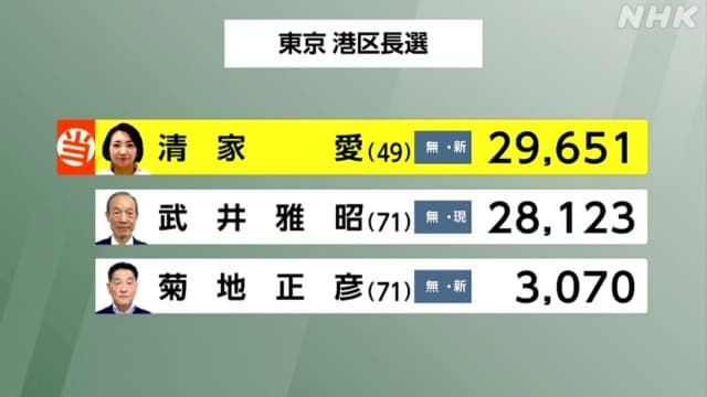 港区長選、自民推薦の現職が敗北! 2024年06月03日 カテゴリ:地方選挙 2: それでも動く名無し 警備員[Lv.29] 2024/06/02(日) 23:28:13.56 ID:ccmLEN8v0 東京・港区長選、5期務めた自民推薦の現職敗れる 清家愛氏が初当選 https://news.yahoo.co.jp/articles/7e338f208d769f65bbb44eb22943abcf28f6ca35 東京都港区の区長選は2日投開票され、無所属の新顔で元区議の清家愛氏(49)が、いずれも無所属で区長を5期20年務め、6選を目指した現職の武井雅昭氏(71)=自民、公明推薦=、新顔の元都議・菊地正彦氏(71)を破り、初当選を決めた。投票率は30.62%(前回30・04%)、当日有権者数は20万617人だった。 引用元:https://nova.5ch.net/test/read.cgi/livegalileo/1717338465/ 【港区長選、自民推薦の現職が敗北!】の続きを読む タグ :#連敗#東京都#清家愛#武井雅昭#港区#港区長選#キングボンビー#自民党