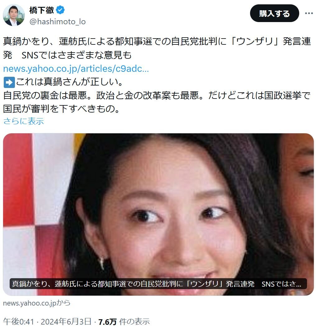 タレントさん「蓮舫の自民党批判にウンザリ」橋下徹「これは正しい。裏金問題は国政選挙の時やれや」 2024年06月04日 カテゴリ:芸能 1: それでも動く名無し 警備員[Lv.5] 2024/06/03(月) 14:43:07.74 ID:50TUR/hx0 引用元:https://nova.5ch.net/test/read.cgi/livegalileo/1717393387/ 【タレントさん「蓮舫の自民党批判にウンザリ」橋下徹「これは正しい。裏金問題は国政選挙の時やれや」】の続きを読む タグ :#都知事選#蓮舫#自民党#橋下徹#議論