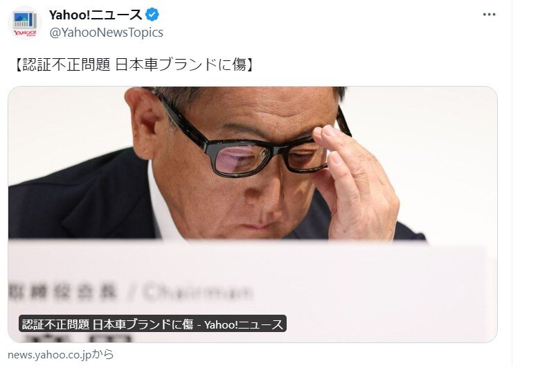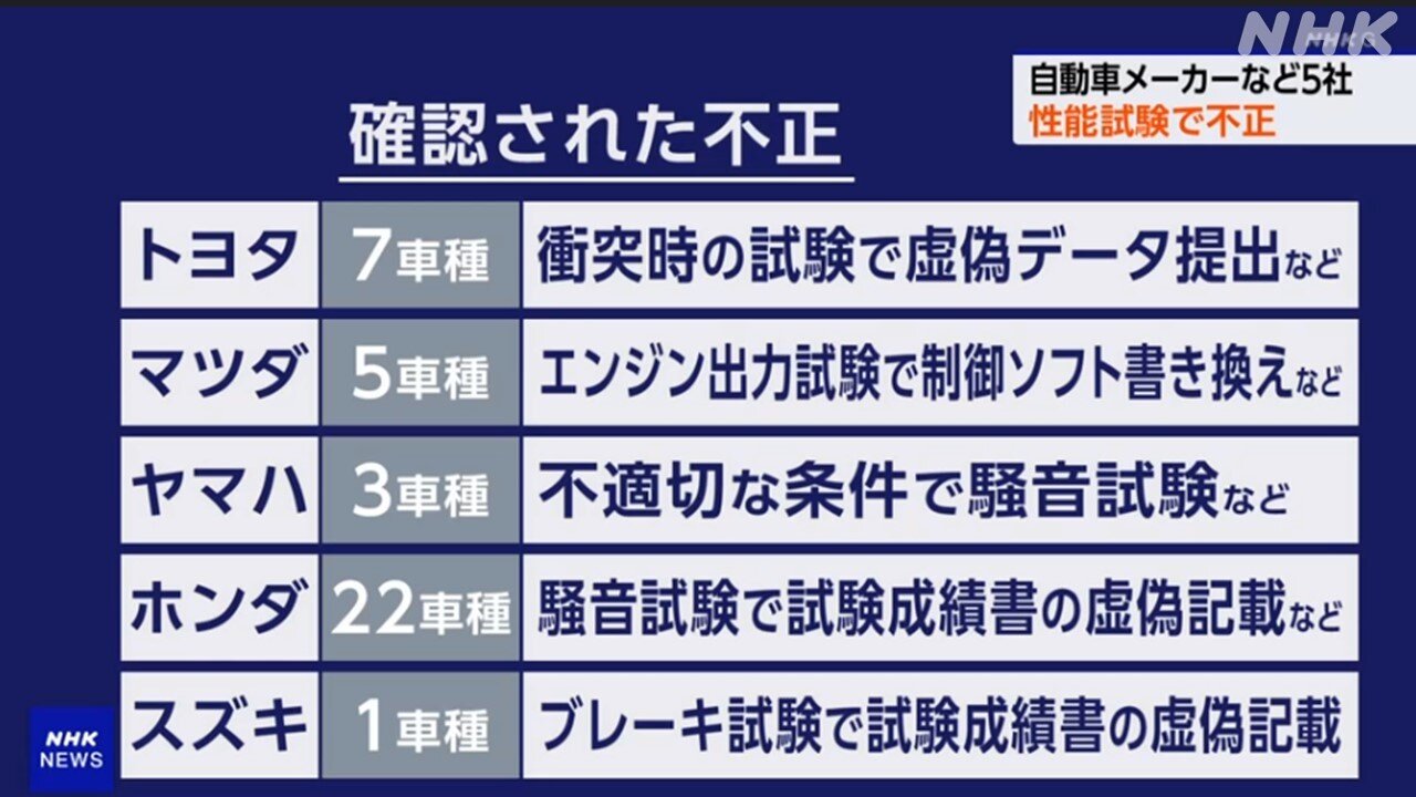 【悲報】トヨタ:不正、ホンダ:不正、マツダ:不正、スズキ:不正、ヤマハ:不正 2024年06月04日 カテゴリ:企業 1: それでも動く名無し 警備員[Lv.6] 2024/06/03(月) 14:50:04.48 ID:50TUR/hx0 型式指定申請における不正行為の有無等に関する自動車メーカー等の調査報告の結果等について 国土交通省は、ダイハツ工業等の不正事案を踏まえ、型式指定を取得している自動車メーカー等85社に対し、型式指定申請における不正行為の有無等に関する調査・報告を指示していました。 その結果、5月末までに自動車メーカー計5社から、型式指定申請における不正行為が行われていたとの報告がありました。 型式指定申請において不正行為を行うことは、ユーザーの信頼を損ない、かつ、自動車認証制度の根幹を揺るがす行為であり、新たな不正行為が明らかになったことは極めて遺憾です。 国土交通省としては、道路運送車両法に基づき、報告のあった5社に対して更なる調査を実施し、その結果に基づき、厳正に対処してまいります。 https://www.mlit.go.jp/report/press/jidosha08_hh_005134.html 引用元:https://nova.5ch.net/test/read.cgi/livegalileo/1717393804/https://nova.5ch.net/test/read.cgi/livegalileo/1717400857/ 【【悲報】トヨタ:不正、ホンダ:不正、マツダ:不正、スズキ:不正、ヤマハ:不正】の続きを読む タグ :#不正#トヨタ#ホンダ#マツダ#自動車#認証制度#日本車#エアバック#日産