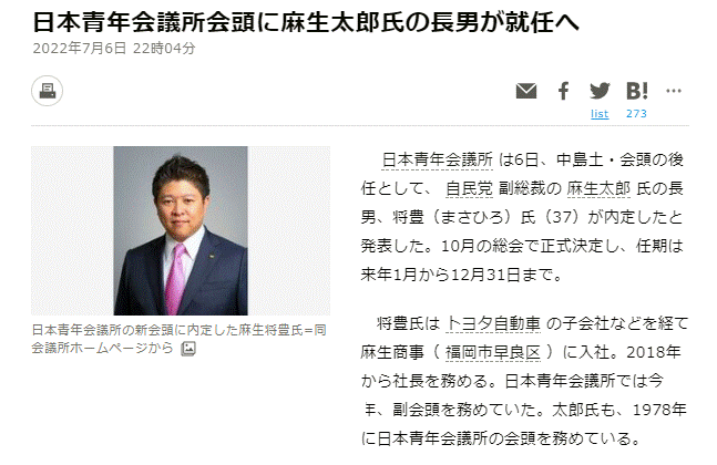 ちなみに、自民党のベテラン議員(安倍元総理に批判的だった事で知られる)・村上誠一郎氏の息子、村上信太郎氏(38歳)も、