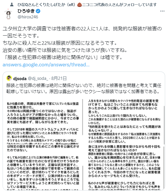 「露出してる派手な格好だからセクハラしてもいい」とか言ってる奴も同じだからな