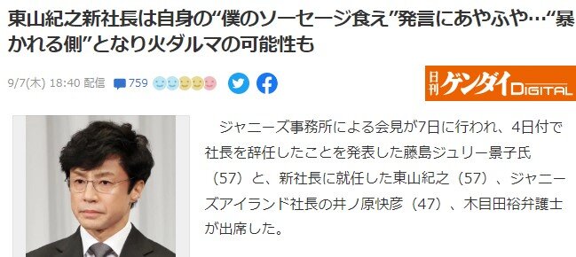 会見には、4日付で社長を辞任した藤島ジュリー景子氏(57)、新社長に就任した少年隊の東山紀之(56)、井ノ原快彦(47)らが出席した。午後2時から始まった会見は4時間を超え、午後6時過ぎに終了。出席者が説明に追われた。