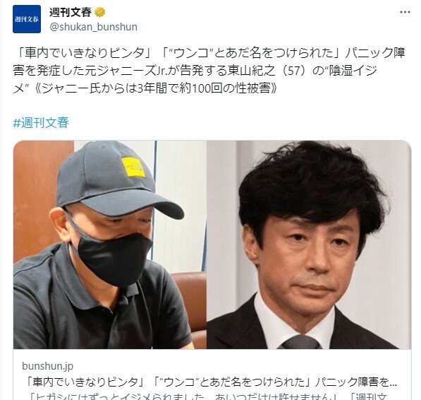 「車内でいきなりビンタ」「“ウンコ”とあだ名をつけられた」パニック障害を発症した元ジャニーズJr.が告発する東山紀之(57)の“陰湿イジメ”《ジャニー氏からは3年間で約100回の性被害》