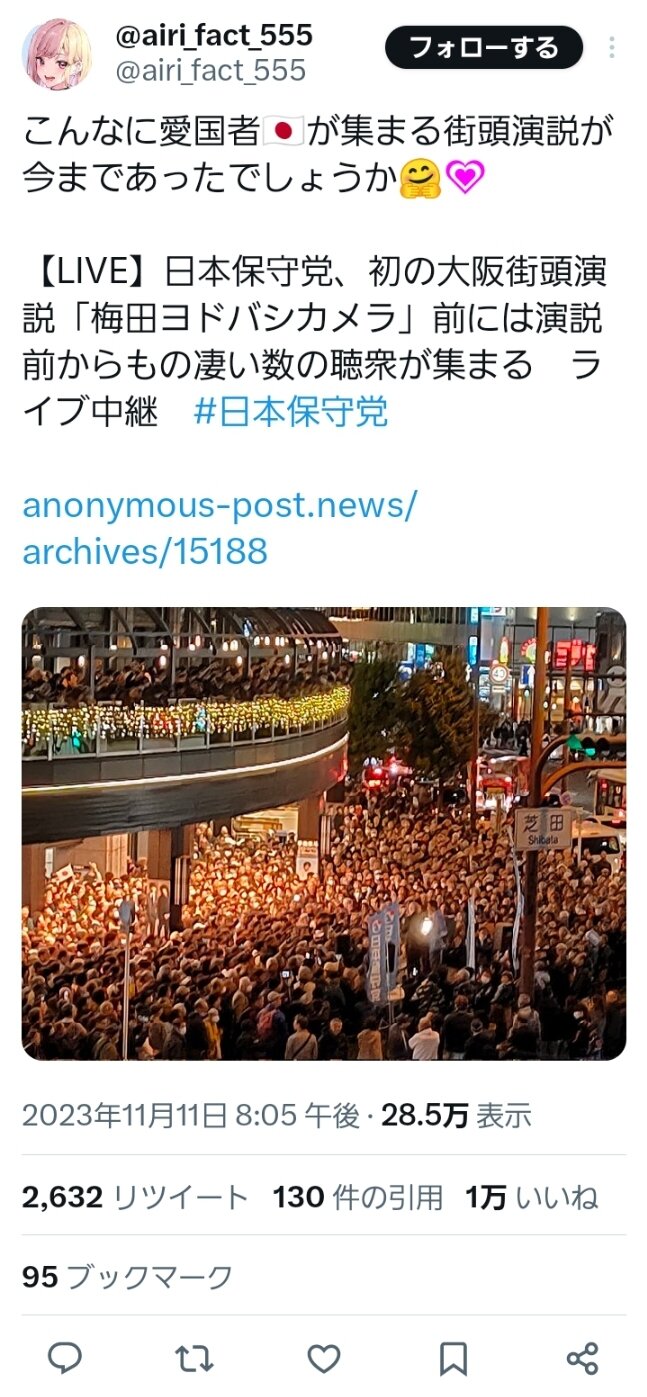 百田はあんな狭く人が集まるところで人を滞留させて大勢の人が保守党()のために集まってるように見せてアピール&自己満足したいだけやから…