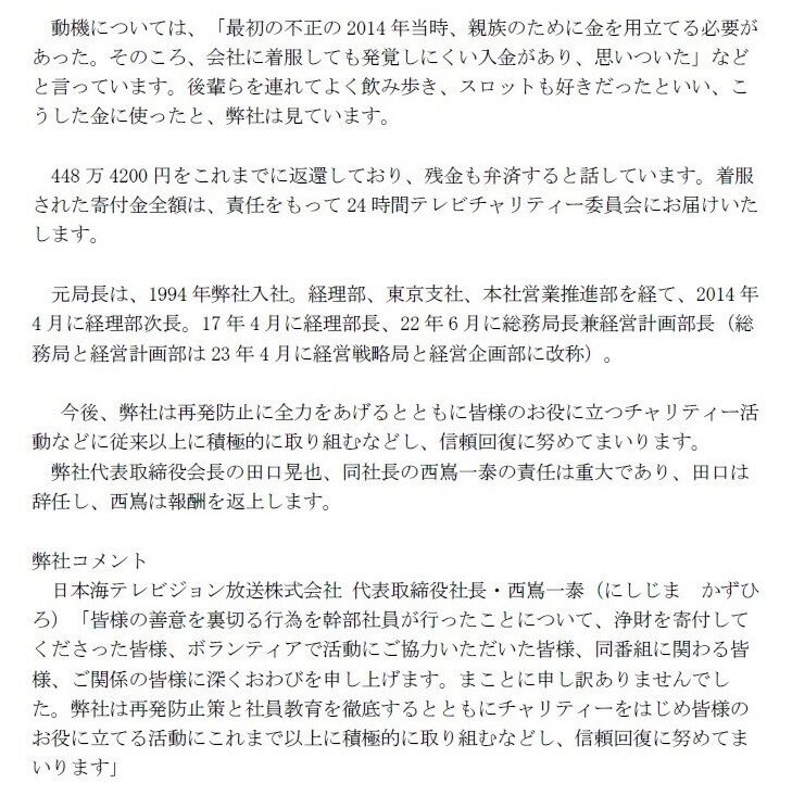 同社によると、元局長は経理担当で、2014年から今年にかけて、「24時間テレビ」の寄付金計264万6020円、14~21年に会社の売上金など計853万6555円をそれぞれ着服した。
