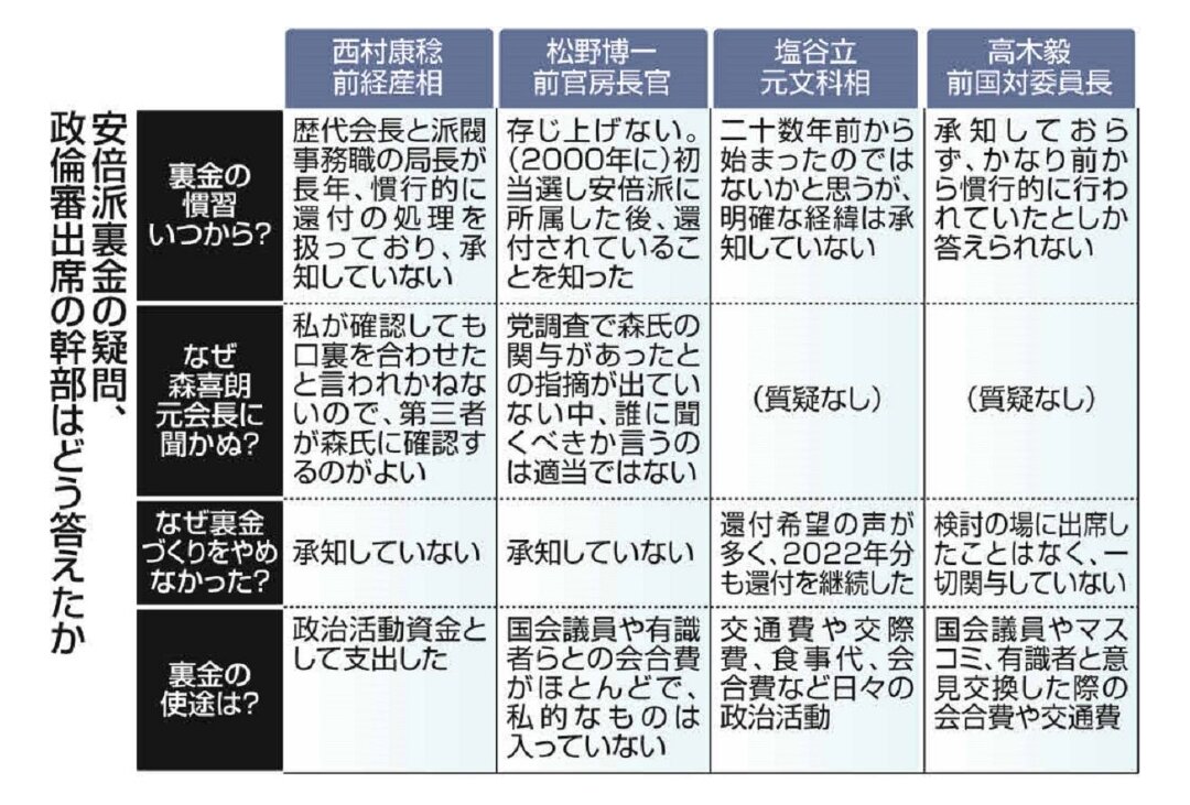 自民党派閥の政治資金パーティー裏金事件で、不記載が5年間で総額約13億5000万円もあった安倍派の幹部4人が出席した1日の衆院政治倫理審査会。いつ裏金づくりが始まり、なぜやめられなかったのか。国民が抱く不信と疑念に対し、4人は「反省」を口にしたが、詳細は「知らない」「存じ上げない」と異口同音に繰り返した。裏金を国会の議員事務所で保管して秘書の判断で支出していたのに、納税を否定するなど、国民感情を逆なでするような責任逃れの弁明が相次いだ。