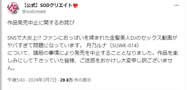 大手AVメーカー「ソフト・オン・デマンド」(以下、SOD)が発表した新作アダルト動画が、韓国の人気アーティスト・DJ SODA(35)を想起させるとして物議を醸している。