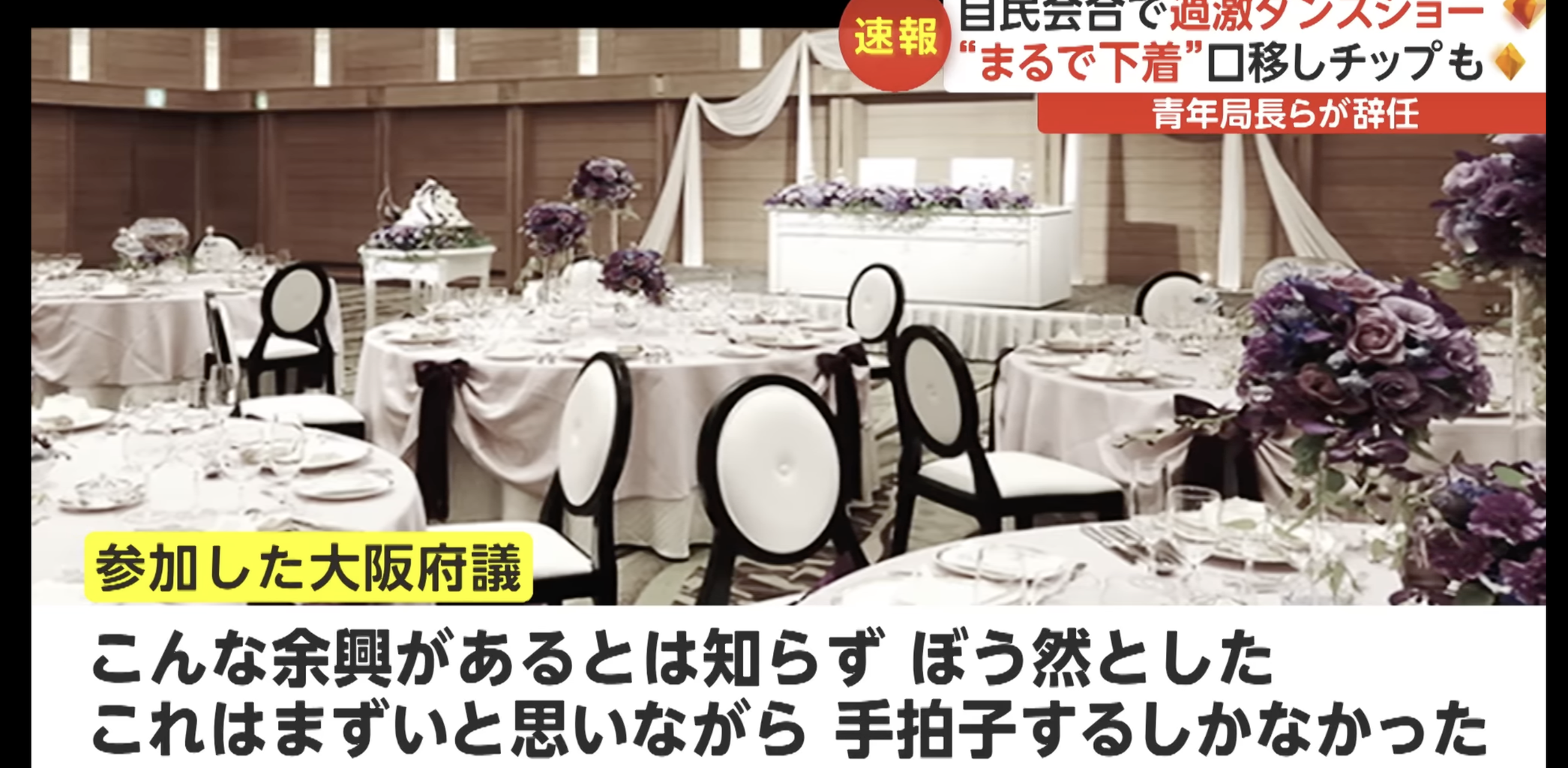 自民・若手議員ら「過激ショー」会合 露出の多い衣装の女性ダンサーのボディータッチ 口移しでチップ お尻を触る参加者も
