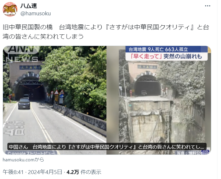中国さん 台湾地震により『さすがは中華民国クオリティ』と台湾の皆さんに笑われてしまう