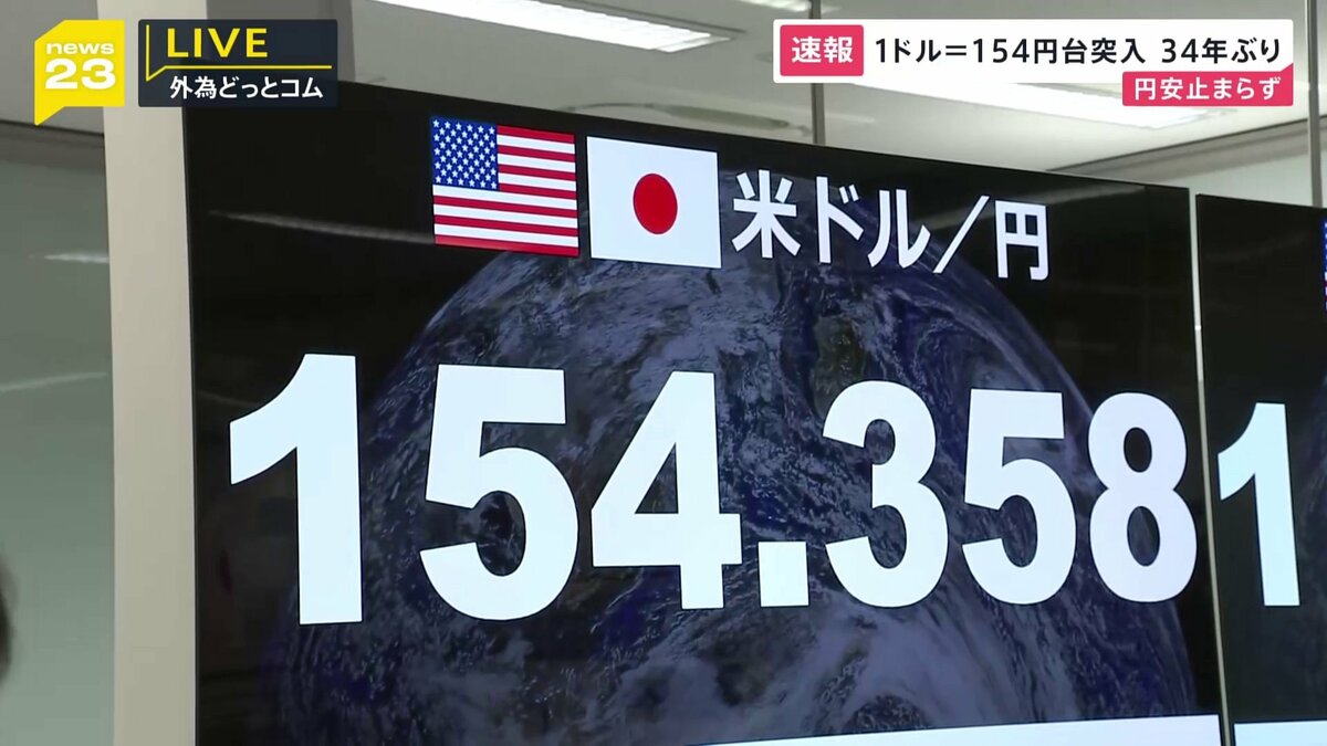 16日の東京外国為替市場は、15日にアメリカで発表された経済指標が市場の予想を上回ったことなどから、円安が一段と進み、円相場は1ドル=154円台で取り引きされています。