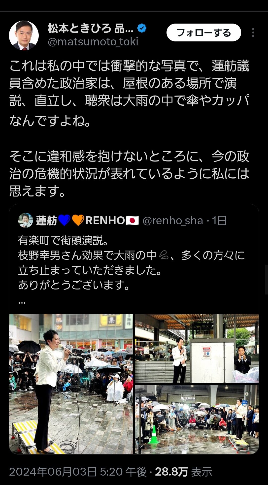 すぐそこに屋根があっても利用しないで支援者に傘持たせて演説するのが維新流なんか?