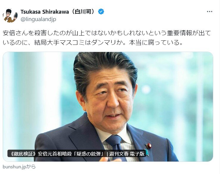 もう一つ判明してる事実として、山上が安倍と統一の関係性を外部から指摘されて最初は否定したがソース確認して安倍ふざけんなとなったってのがある(これはSNS上の書き込みとして実際確認されてて、後の山上の供述とも一致してる)