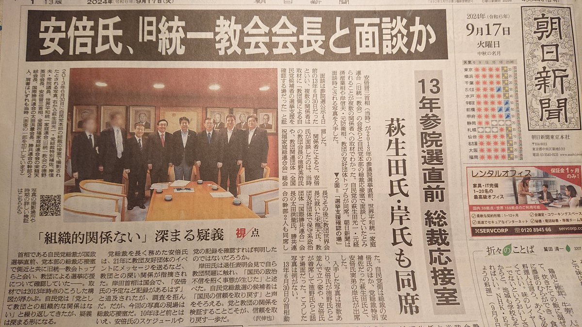 安倍晋三首相(当時)が2013年の参議院選挙直前、世界平和統一家庭連合(旧統一教会)の会長らと自民党本部の総裁応接室で面談していたとみられることが複数の関係者への取材でわかった。自民党の萩生田光一・元経済産業相や岸信夫・元防衛相、教団の友好団体トップらが同席。朝日新聞は面談時とされる写真を入手した。