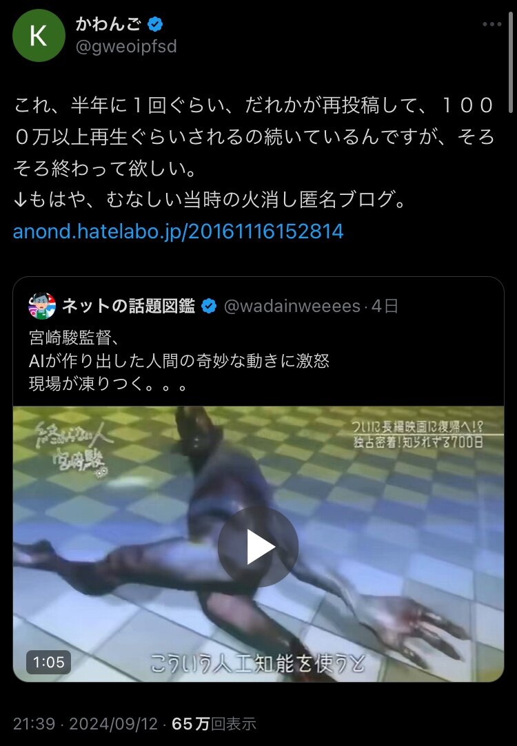 自慢の動きがキモいAIをパヤオに「生命に対する侮辱だ」とか言われて言い訳にも答えにもなってないこと言ってるのは仕方ないにしても、カワンゴは見た感じ困惑するでもなく何も思ってないかのような顔だなぁ