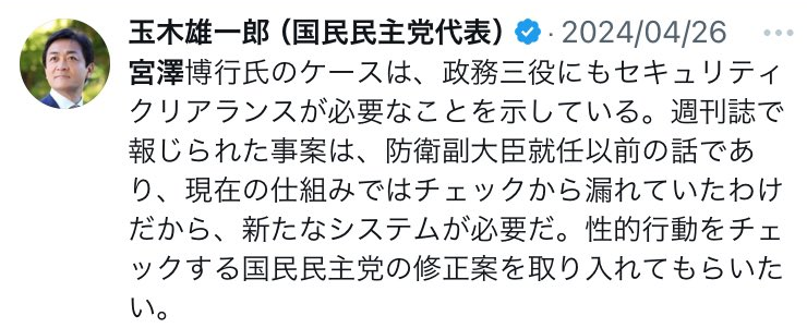 玉木本人がセキュリティ・クリアランスを重要視してる以上は