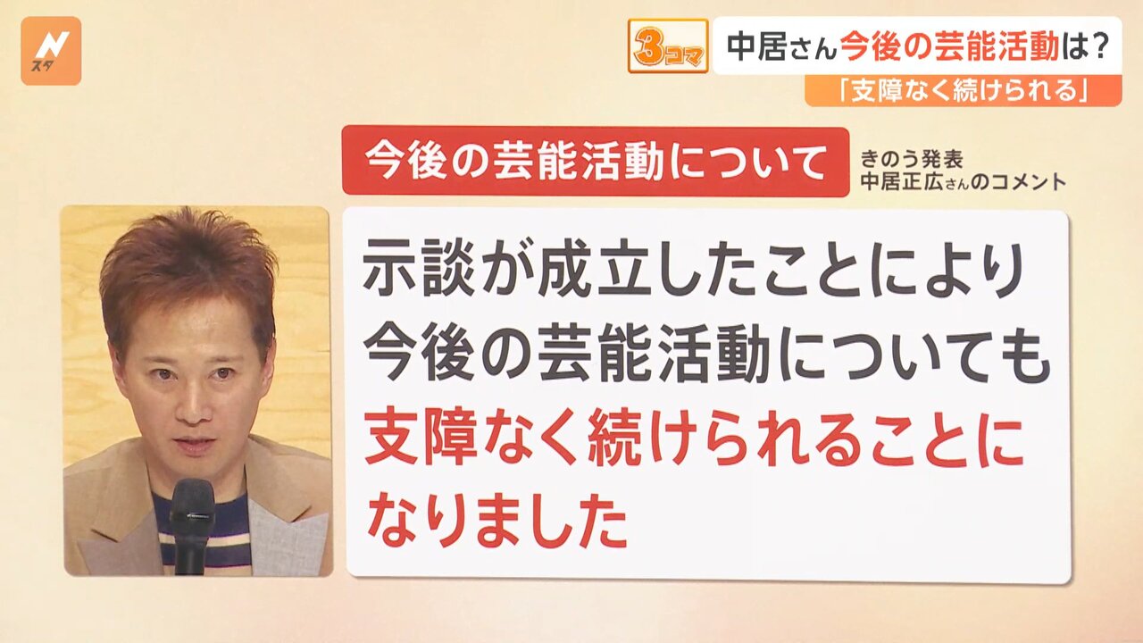 中居は報道を受け、今月9日に公式サイトで「お詫び」と題して声明を公表。「トラブルがあったことは事実」と認め、「このトラブルにおいて、一部報道にあるような手を上げる等の暴力は一切ございません」と一部報道を否定。「なお、示談が成立したことにより、今後の芸能活動においても支障なく続けられることになりました」と記していた。