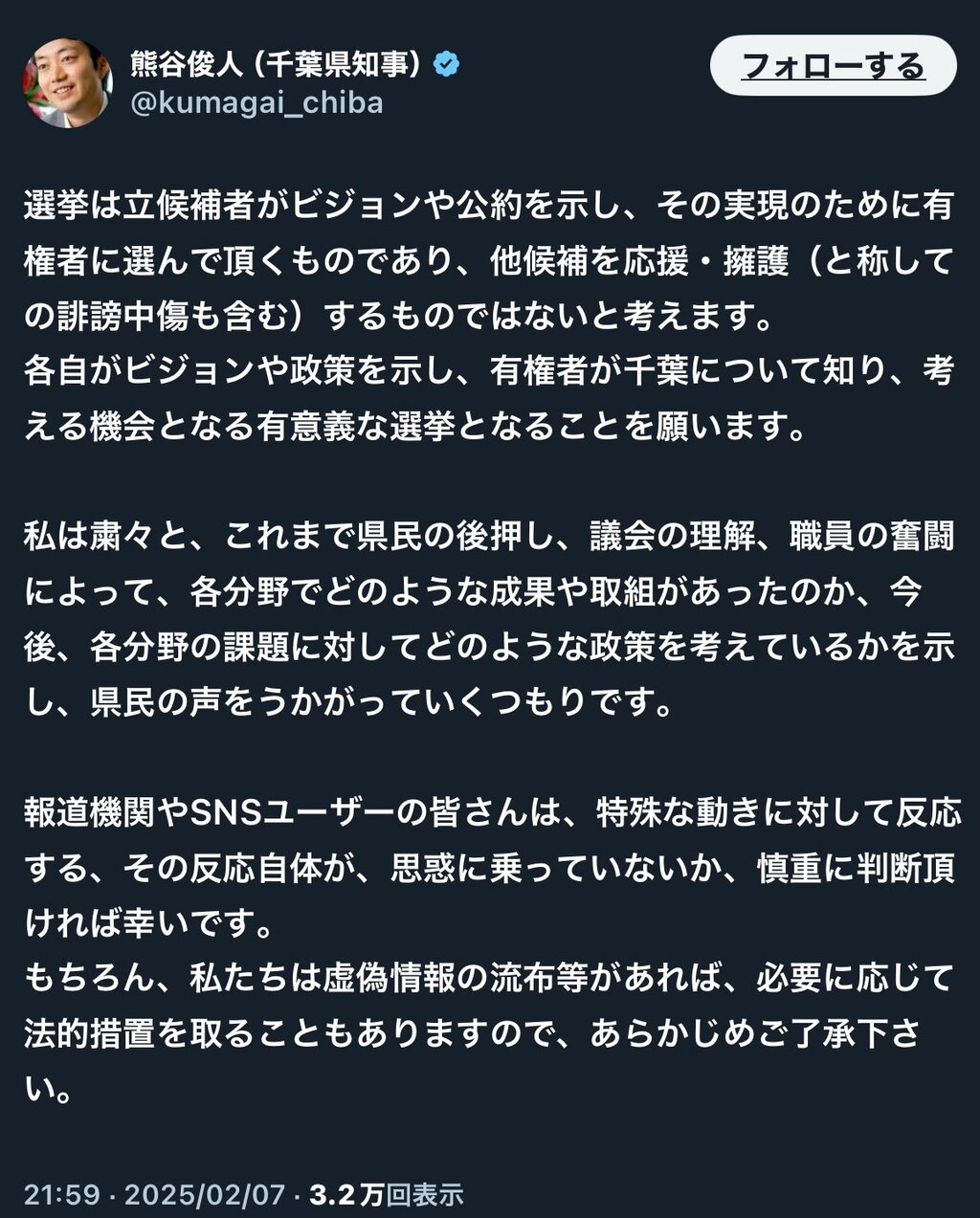 立花氏は現職の熊谷俊人知事(46)が選挙に関するSNS発信について、第三者による虚偽投稿対策として「一定の規制を」と訴えたことに触れ、「SNS規制は大賛成」「今回僕に投票しなくていい。熊谷知事を応援する『二馬力選挙』をする」などと訴えた。