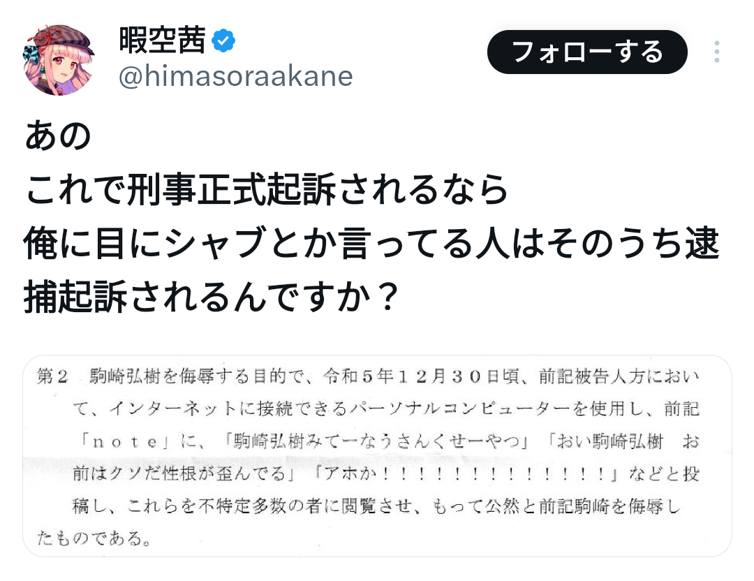 被害届も提出されてないのに侮辱罪とか名誉棄損で起訴されるわけないやろ…