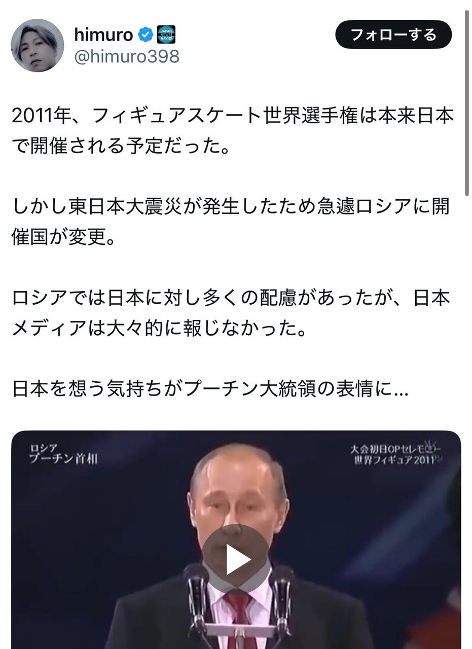 前にJNN界隈の奴らがプーチンの感動エピソードみたいなのツイートしてバズってたよな