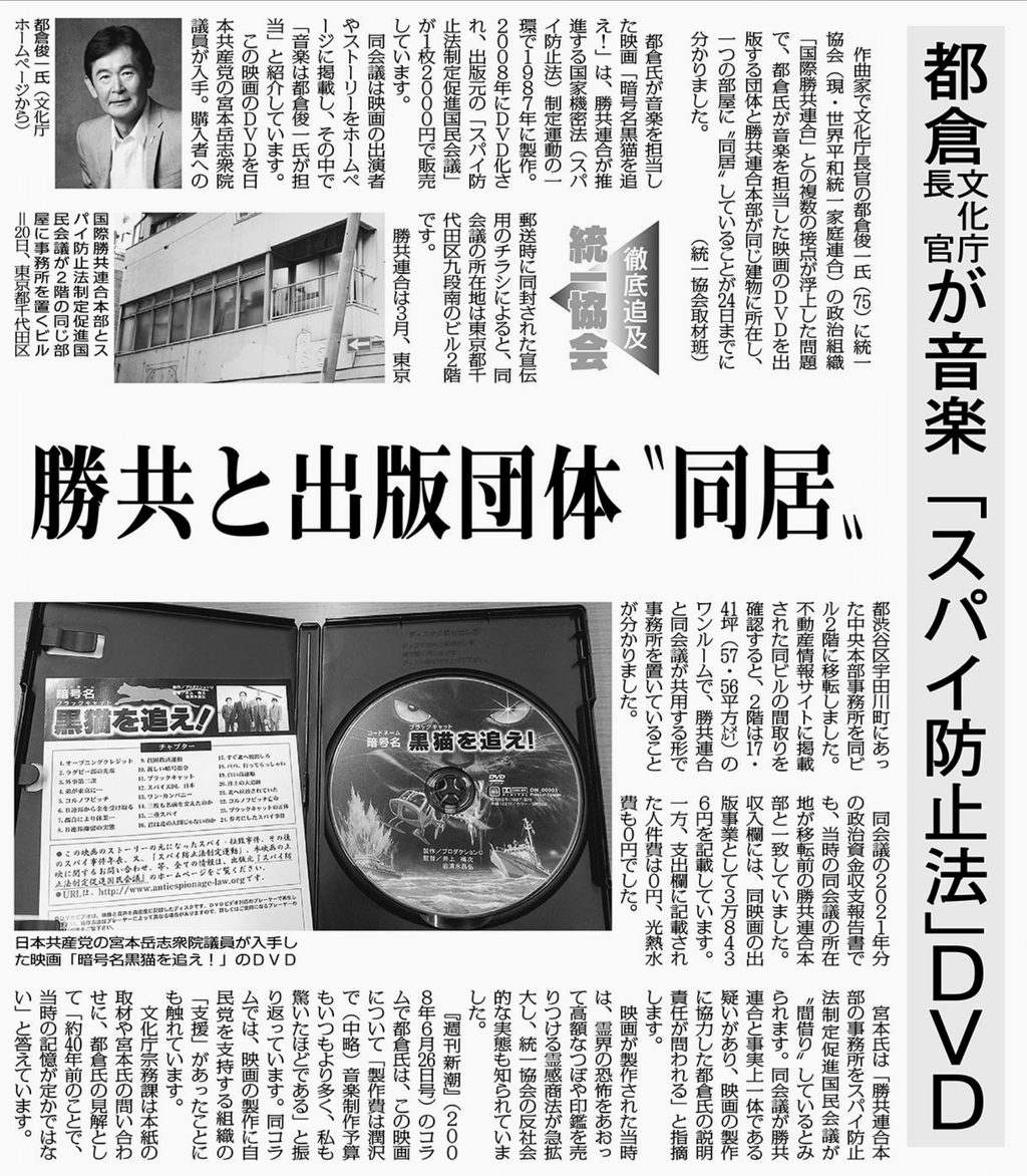 >世界平和統一家庭連合(家庭連合、旧統一教会)の関連団体、国際勝共連合の渡邊芳雄会長は7日、横浜市内で講演し、「日本を守るためスパイ防止法を一刻も早く実現する」よう訴えた。