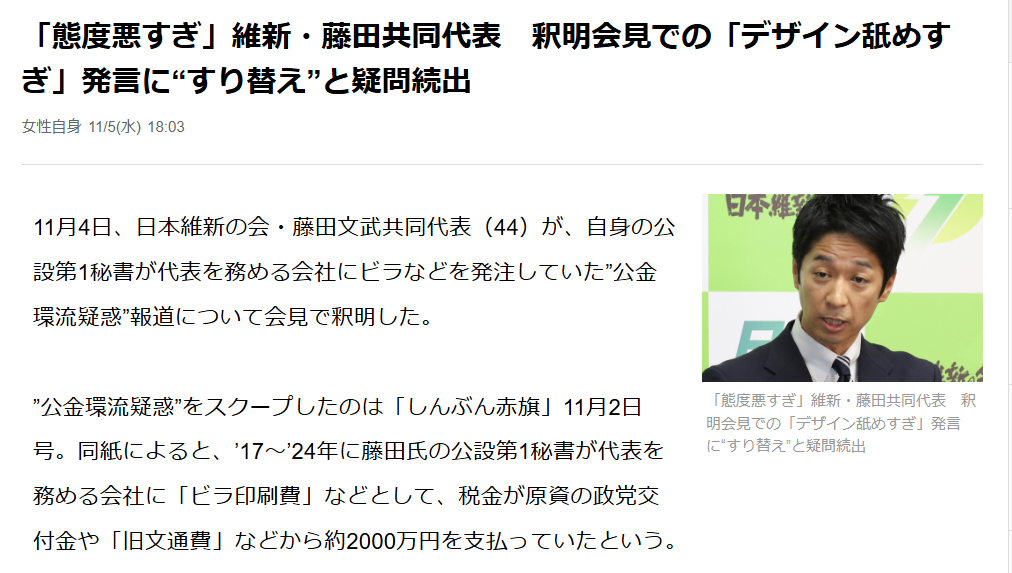藤田氏は先月、共産党の機関紙「しんぶん赤旗」で2017~24年に公設第1秘書が代表を務める会社に「ビラ印刷費」などとして約2000万円を支払い、同社から秘書に年720万円の報酬が支払われていたと報じた。政党交付金なども含まれており、「身内への税金環流ではないか」などと指摘されていた。4日に開いた会見では「法的にはどこから切り取っても適正」と反論した一方で、批判を受け止めて今後は当該会社に発注しないと説明した。