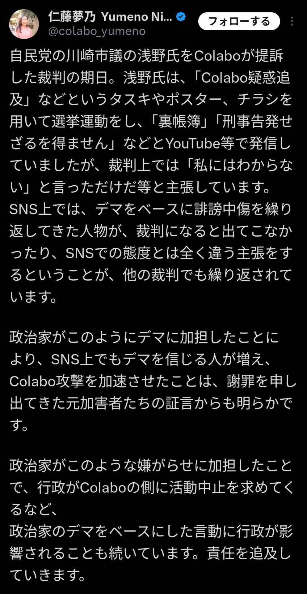 裁判は2年も続いているそうで長引いている印象だが、「やん」はX上での仁藤さんとcolabo批判を全くやめていないし、余程勝訴することに自信があるらしい(普通は裁判への影響を考えて批判的投稿はしない筈だが)