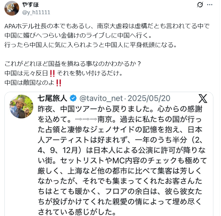 「ネトウヨはアーティストじゃなく中国に怒れよ」的な拗らせたネオコンネット民の反応も含めて、日本から十分に距離を取ったほうが良いと思ってたからこれで良いんだよ