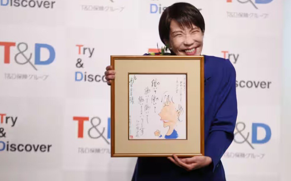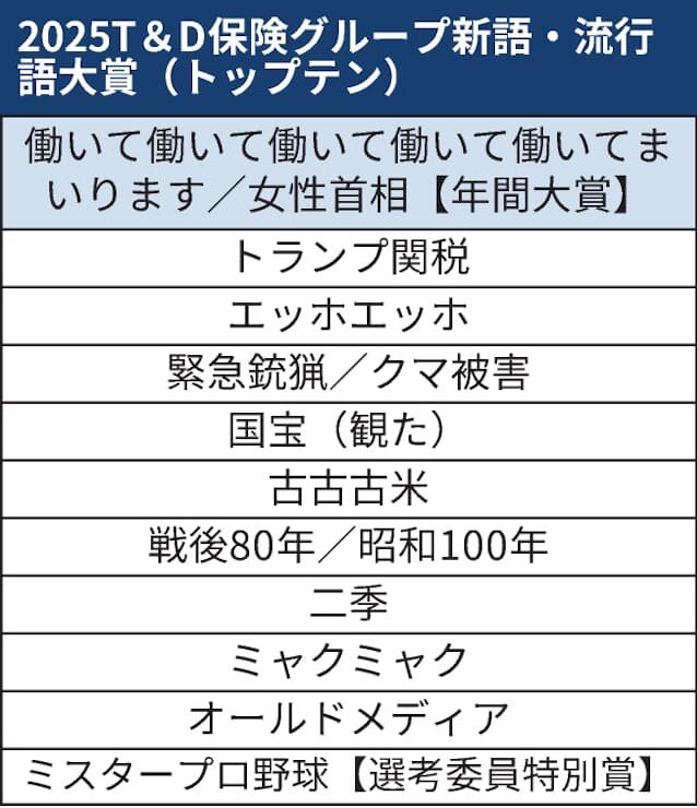 >高市首相は自民党総裁に選出された直後に「働いて働いて働いて働いて働いてまいります」と発言し、首相就任わずか16日間でノミネート30語に入った。表彰式には青いジャケット姿で出席。高市首相は「皆さま、こんにちは。内閣総理大臣の高市早苗でございます。年間大賞を賜りまして、誠にありがとうございます」とあいさつした。