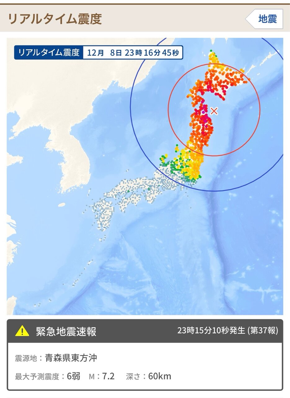 8日午後11時15分ごろ、青森県三八上北で震度6強を観測する地震があった。震源は青森県東方沖。震源の深さは50キロ。地震の規模を示すマグニチュード(M)は7・6と推定されている。気象庁は青森県太平洋沿岸、岩手県太平洋沿岸などに津波警報を出した。