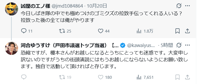 投稿を見た人が通報し、県警が捜査。翌26日に捜査員が家宅捜索のため榎本容疑者の自宅を訪れたところ、榎本容疑者が包丁を手に威嚇したため、公務執行妨害の疑いで現行犯逮捕していた。「政治活動家」を自称しており、同署は動機を調べている。