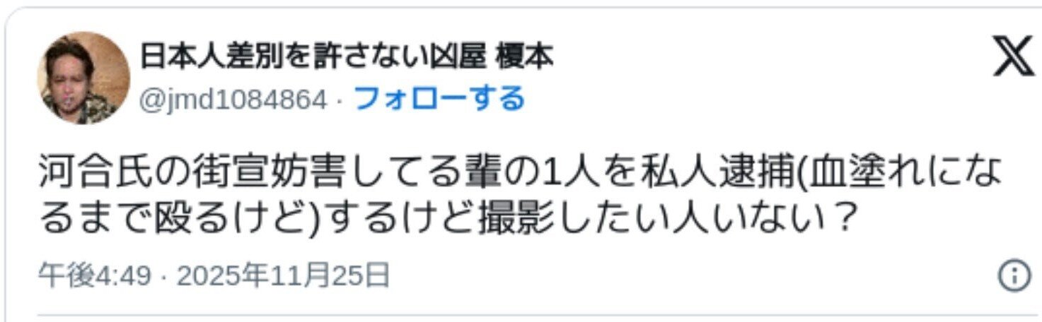 「榎本展明 鉄パイプ」でヤフーリアルタイム検索すれば出てくるが、この男は、今年9月に蕨駅前であった「カウンター側」の集会に、鉄パイプで威嚇して逮捕され、罰金刑が下った人物らしい。