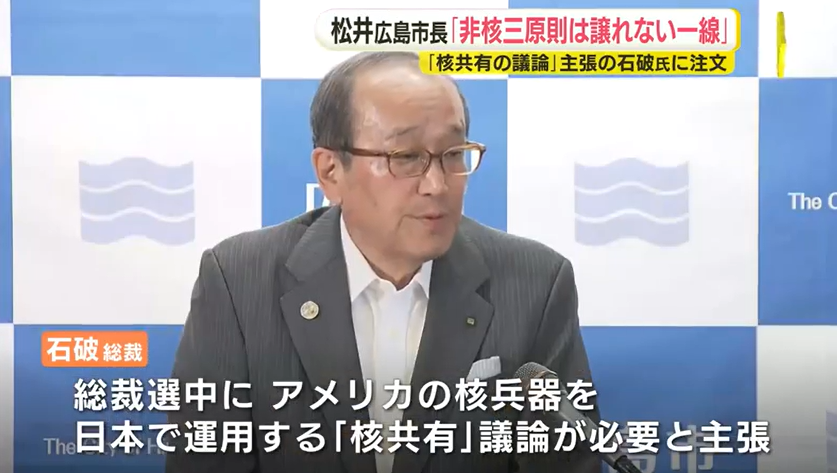 石破茂首相は6日午前、広島市で開かれた平和記念式典に出席した後の記者会見で「非核三原則を政策上の方針として堅持しており、見直す考え方はない」と述べた。核を含む米国の拡大抑止の強化と「核兵器のない世界」を目指すことは「矛盾することではない」と強調した。