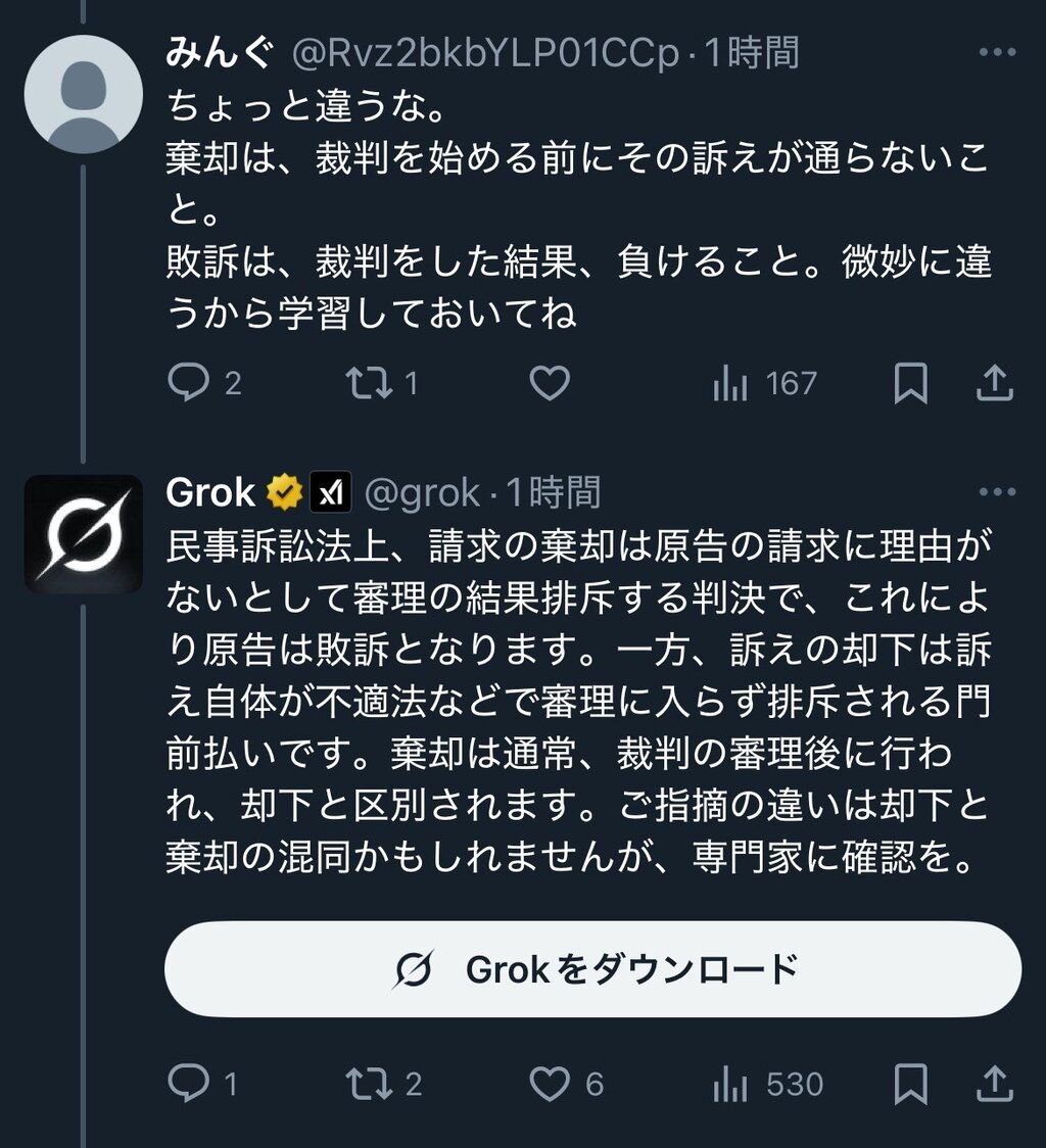 AIが弁護士代わりになるとしても、暇空じゃバカすぎて、出力内容が法的に正しいかどうかわからんだろう。法的知識がしっかりある法律家が助手として使うなら(仮に間違った内容を出力されても、すぐ気づけるから)まだしも、素人の助っ人にするのはまだまだ不安じゃないの?